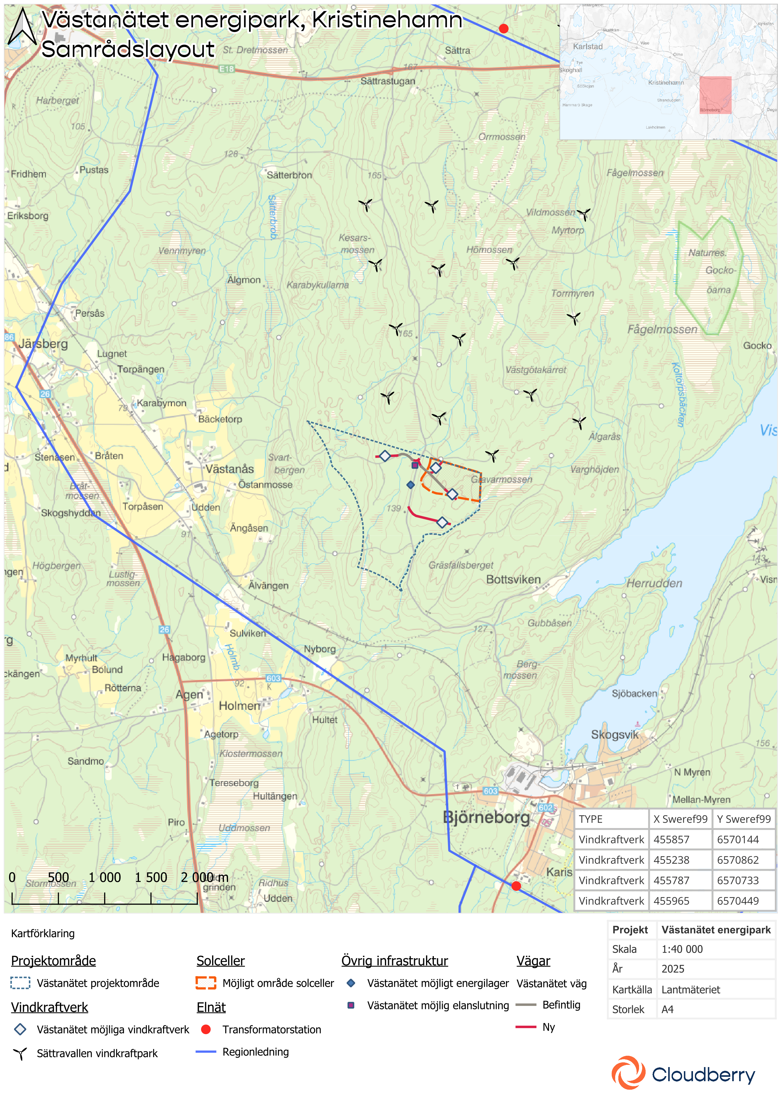 Cloudberry Clean Energy planerar att utveckla en energipark i Kristinehamns kommun, ca 7 kilometer sydost om Kristinehamns tätort. Projektområdet ligger delvis i av Energimyndigheten utpekat riksintresse vindbruk-område. Syftet med projektet är att bidra till omställningen till förnybar energi genom etablering av en energipark bestående av vind- och solenergi samt lagring i form av batteri. I enlighet med miljöbalken (6 kap.) hålls nu samråd för att informera om projektet och ge allmänheten, myndigheter och organisationer möjlighet att lämna synpunkter innan den fortsatta planeringen.